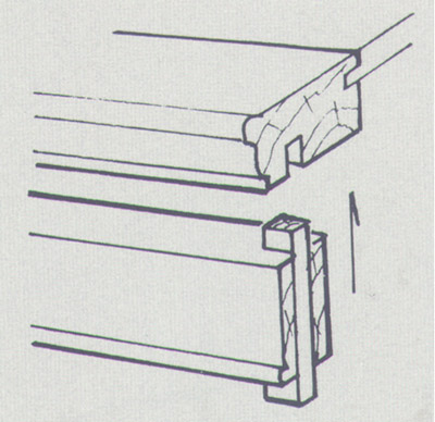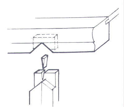 半榫破頭楔(圖)破頭楔用在半榫之內,易入難出。破頭楔一旦在半眼的卯里撐開后,榫頭將很難再退出,是一種沒有可逆性的獨特而堅固的結構,最適宜用在像抽屜桌桌面下的矮老等懸垂而負重的部件上。這種作法不常使用,因為它沒法修復,被稱為“絕戶活”。