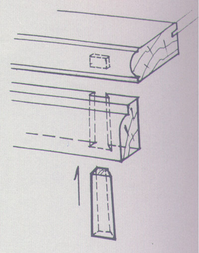 透銷(圖)是在栽銷的基礎上,使銷子延長并通透于其一板材的中心,多見于大型的鐵力、紫檀等床案厚重的牙板與大邊的拍合,十分堅固。