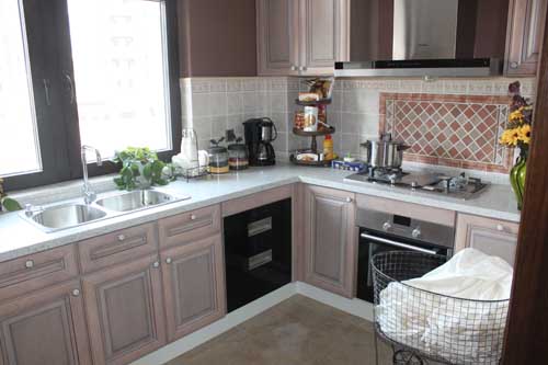 小戶型廚房可以選擇緊湊型櫥柜,根據需要進行組合疊放,節省空間。把柜門換成透明玻璃,方便查找。