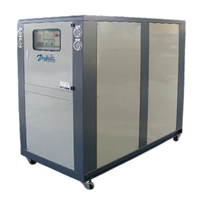其次,要了解水冷箱式冷水機是由哪些組成的。一般來說,冷水機主要有四大件,即壓縮機、蒸發器、冷凝器、節流元件。而實際上是遠遠不止這些的,比如DYJ-W系列水冷箱式冷水機的組成就有以下這么多:渦旋式壓縮機,殼管式蒸發器,水箱盤管式蒸發器(水箱需要做保溫處理),循環水泵,膨脹閥,過濾器,電磁閥,壓力表,電控系統,數字顯示控制面板,腳輪等等(根據型號大小組件會稍有不同),并充好制冷劑做好性能測試,用戶將水冷箱式冷水機買回去以后,只要將冷卻水塔,循環水泵,冷水機以及被制冷設備之間用水管連接即可使用。