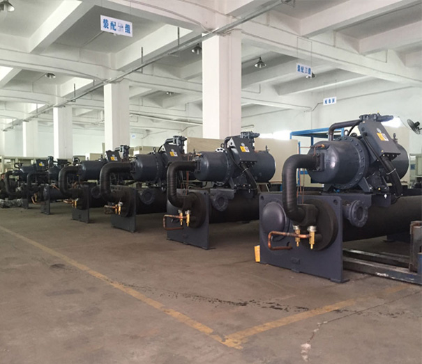 冷水機制冷劑輪回系統時蒸發器中的液態制冷劑吸收水中的熱量并開始蒸發,終極制冷劑與水之間形成一定的溫度差,液態制冷劑亦完全蒸發變為氣態后被壓縮機吸入并壓縮,氣態制冷劑通過冷凝器吸收熱量,凝聚成液體,通過熱力膨脹閥節流后變成低溫低壓制冷劑進入蒸發器,完成制冷劑輪回過程。